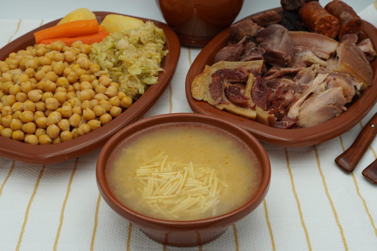 La experiencia del cocido se sirve en tres partes: primero la sopa ligera, luego las legumbres y verduras, y finalmente las carnes y embutidos, cada uno aportando diferentes sabores y texturas al plato.
