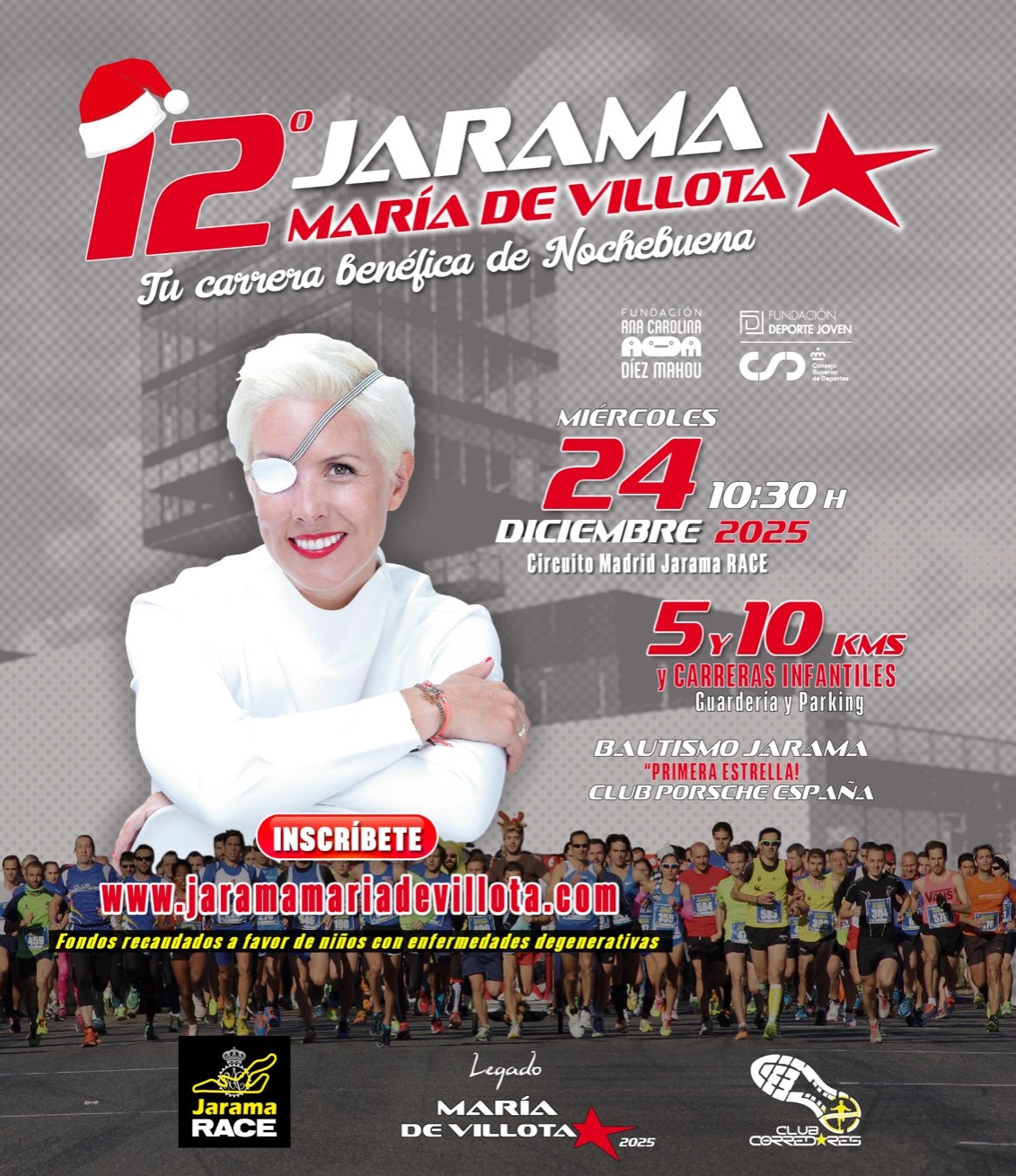 La XII JARAMA MARÍA DE VILLOTA es una carrera benéfica en Nochebuena en el Circuito de Madrid, con distancias de 5 y 10 km, además de carreras infantiles. Las inscripciones financian tratamientos para niños con enfermedades neuromusculares. Se requiere un litro de leche al recoger el dorsal. Habrá premios y servicio de guardería.