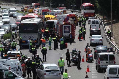 Facultativos del Samur han instalado en el lugar del accidente un hospital de campaña (P.M.A.) en el que están atendiendo a los heridos. El conductor de uno de los autobuses, que ha tenido que ser rescatado del interior del vehículo por los bomberos, es el que se encuentra en un estado más grave, y ha sido trasladado al Hospital 12 de Octubre con politraumatismo torácico y abdominal y heridas en las piernas. De momento 15 de los heridos han sido traladados a centros hospitalarios y se desconoce cómo se produjo el accidente, que tuvo lugar sobre las 12.30 horas.