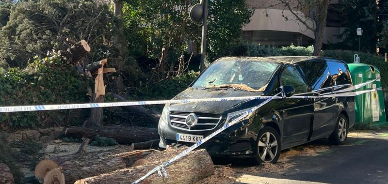 La Comunidad de Madrid se enfrentó ayer viernes, a una jornada complicada debido a las intensas ráfagas de viento que han superado los 90 km/h en algunas áreas. Un fenómeno meteorológico que ha provocado la caída de varios árboles, generando importantes incidencias en diferentes distritos de la Comunidad, como es el caso de la calle Dalia y Azalea del Soto de La Moraleja, donde un árbol destrozó un vehículo que estaba aparcado.