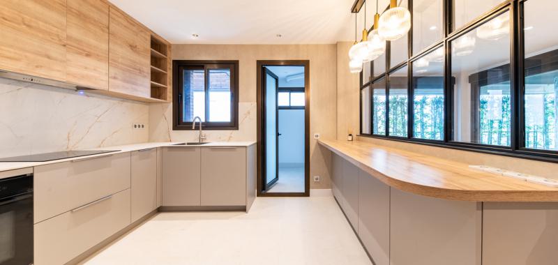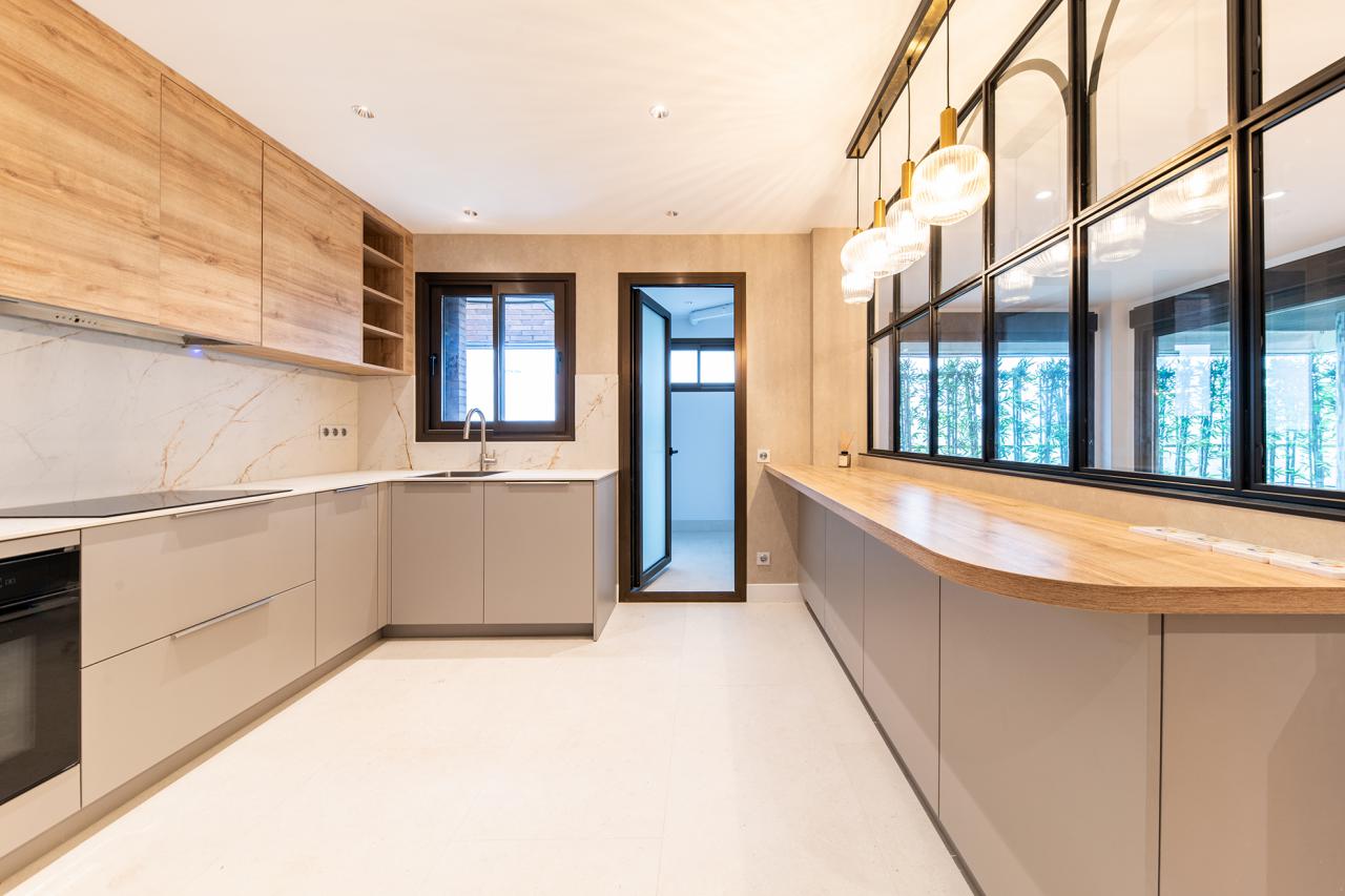 El piso ha sido reformado y se han incorporado materiales de gran calidad en todas las estancias, pero la última renovación ha sido la cocina con muebles de gran calidad al igual que sus electrodomésticos.