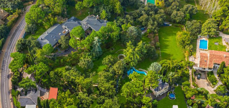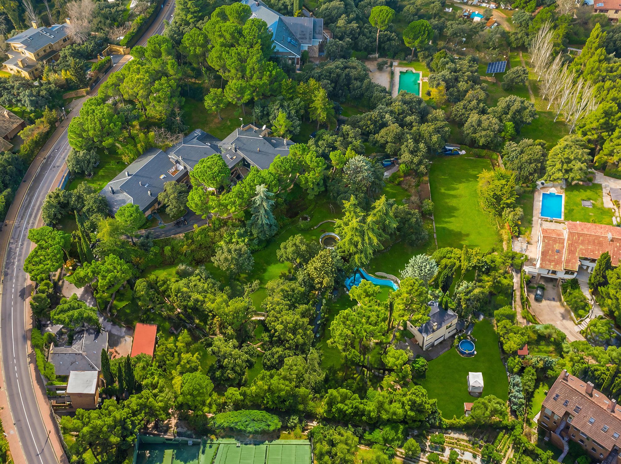 El tipo de parcela tiene desnivel, con una pista de tenis ya en desuso y una piscina grande pero también en desuso. La ubicación es buena, ya que está en el entorno de las mejores viviendas de esta urbanización.